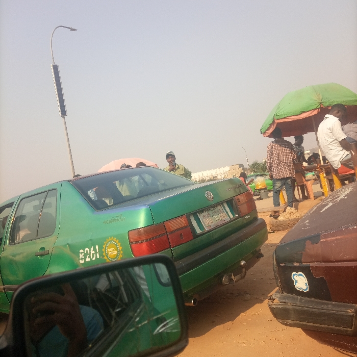 The image depicts an outdoor street scene in Kuje, Abuja, Nigeria, under a bright, hazy sky