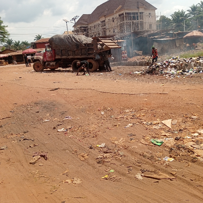 The image depicts an outdoor refuse disposal site on an unpaved, reddish-brown dirt road in Nsukka, Nigeria