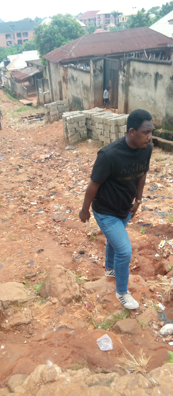 A man is depicted walking across an unpaved, reddish-brown dirt path in Onitsha, Nigeria