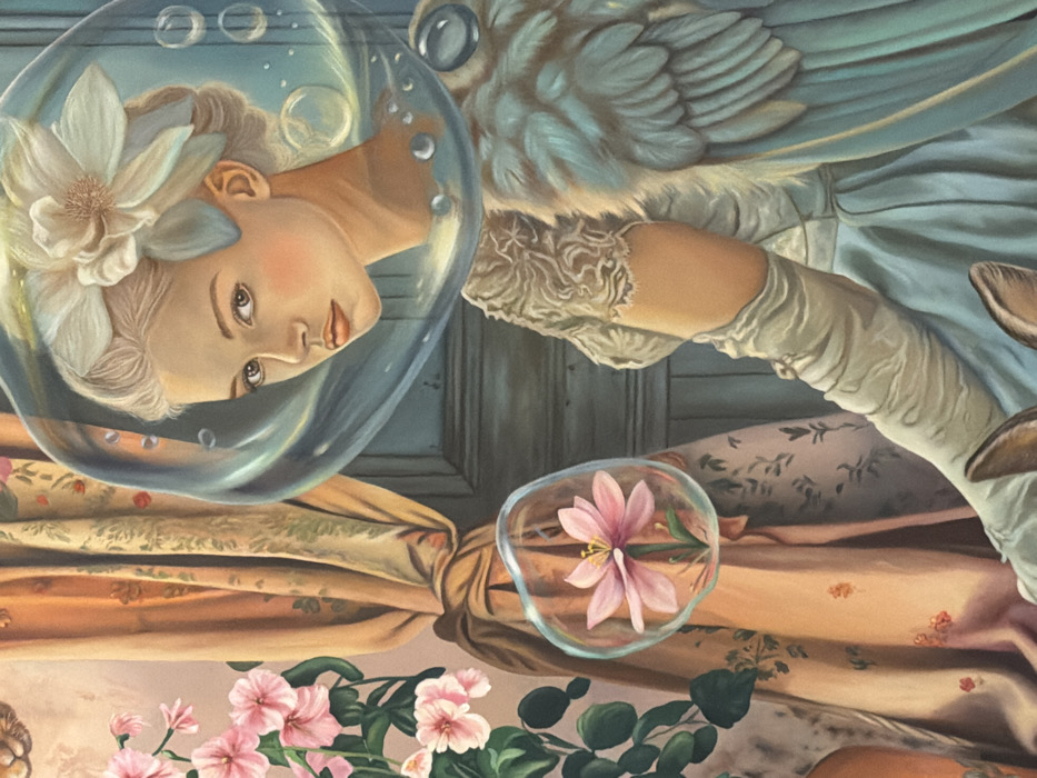 An oil painting depicts a surreal, fantastical portrait of a young woman in an indoor setting