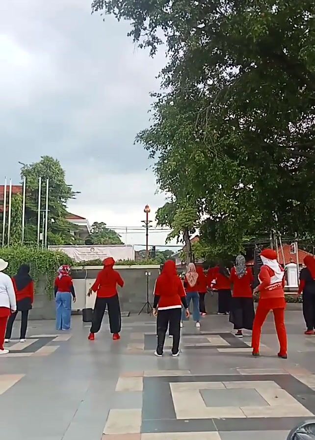 A group of people are practicing a dance routine outdoors on a paved area, possibly a public square. They are dressed mostly in red and black athletic wear, with some wearing white headscarves. The camera angle is positioned vertically, showing a view of the sky and trees in the background. The group is aligned in a line and they appear to be following instructions, likely from an instructor not seen in the frame. The weather seems overcast.