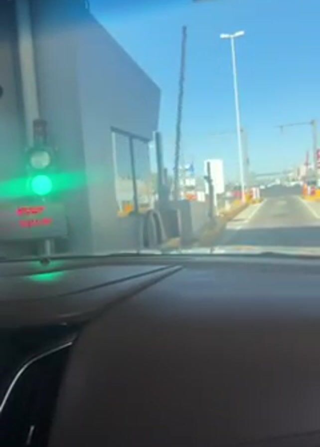 A car is at a toll booth, ready to proceed through as indicated by the green light