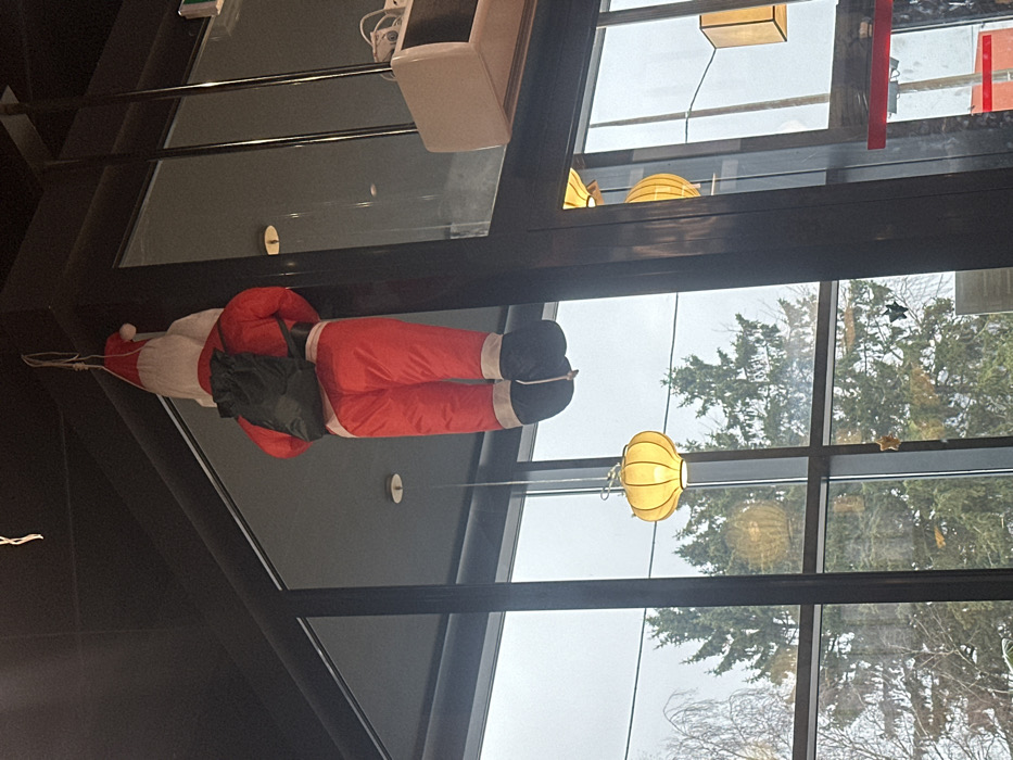 In Noyelles-Godault, France, a large Santa Claus figure is suspended upside down from a dark ceiling inside a building. The figure is clad in a red suit with white trim and black boots, and a black backpack is visible on its back. A thin, light-colored rope is tied around the figure's ankles, extending upwards to an attachment point on the ceiling. The scene is viewed through expansive, dark-framed glass windows that reveal an overcast sky and a landscape featuring prominent coniferous trees and bare deciduous trees. Inside the building, several spherical yellow pendant lights hang from the ceiling, and a white rectangular unit is affixed to a vertical column on the right side of the frame. Reflections of the interior are present on the window surfaces.