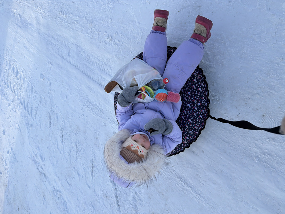 A young child, dressed in a lavender snowsuit, a fur-trimmed hooded jacket, a beige knitted animal-face hat, and grey mittens, lies supine on a black snow tube with a floral pattern. The child holds a dark, indistinct object in their left hand and looks towards the viewer's right. A clear plastic bag filled with multiple colorful objects, likely toys, rests on the snow tube adjacent to the child. Red and beige winter boots are visible on the child's feet. A black strap extends from the bottom of the snow tube, disappearing out of the frame towards the bottom-center, indicating the tube is being pulled across a snow-covered surface. The ground exhibits visible tire or sled tracks. The scene is located outdoors in the city of Alnashi, Russia.