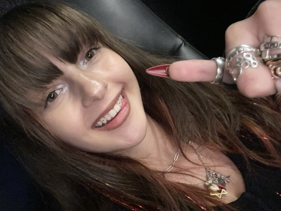 A woman with brown hair and bangs smiles, showcasing teeth adorned with small, sparkling embellishments. Her finger, featuring a long, pointed, red-tipped nail, is prominently displayed, covered in silver rings with intricate designs. She wears a silver chain necklace with charms. A glimpse of what appears to be a black surface is visible behind her head and shoulder. Her makeup includes a light, shimmery eye shadow.