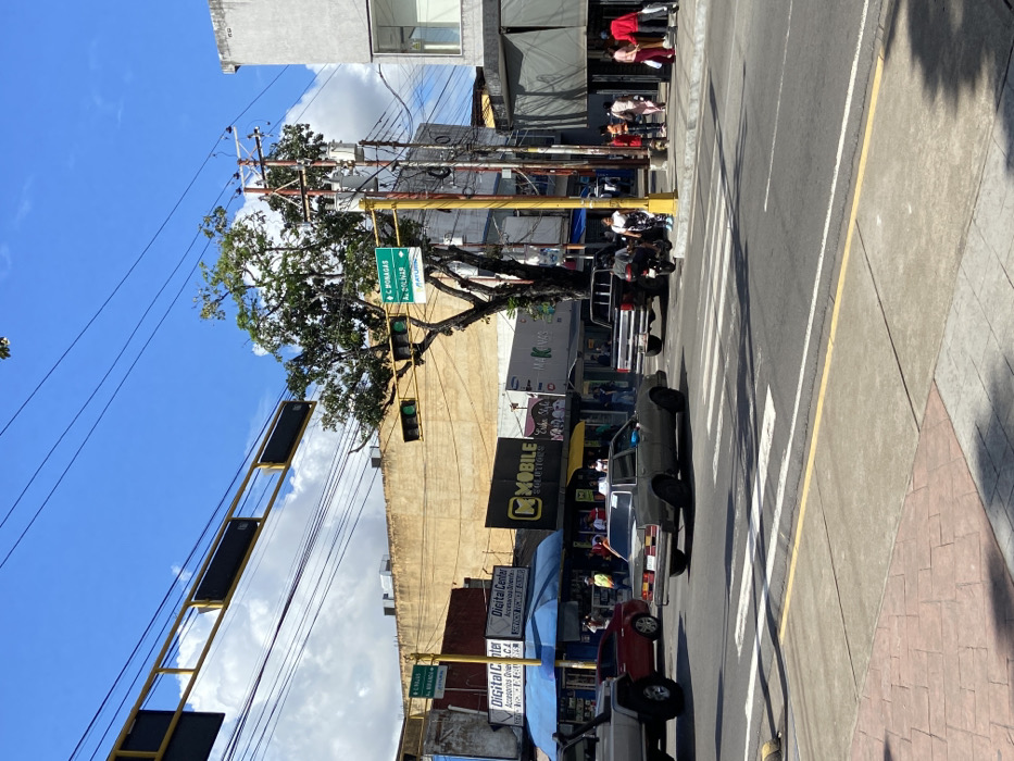 An urban street scene shows cars, a truck, and motorcycles stopped at a crosswalk with a green traffic light overhead. Pedestrians are visible on the sidewalk. A street sign indicates directions to "C. Porbagas" and "A. Dilinas". A "Mobile Solutions" sign stands out amongst various shop signs. Power lines and a bright blue sky with clouds fill the background.