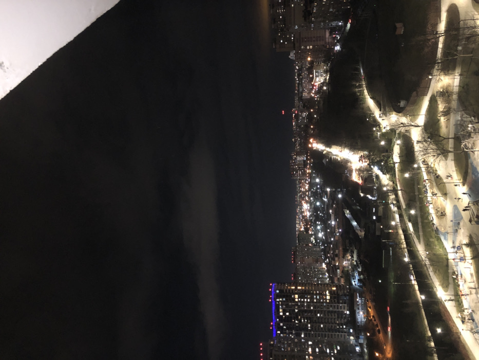 An aerial night view shows a dark expanse, likely a lake or ocean, bordering a brightly lit cityscape. Numerous buildings with illuminated windows dominate the foreground, alongside a park illuminated with streetlights, highlighting pathways and open spaces. The overall image captures the contrast between the dark water and the lively urban environment.