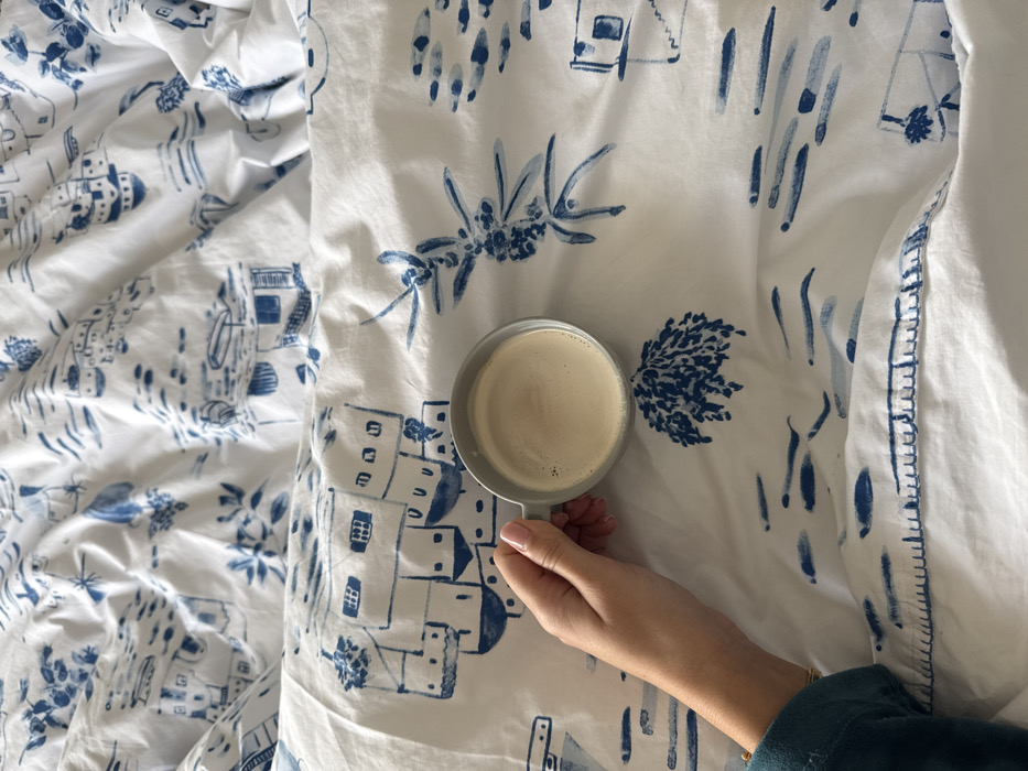 A human left hand, adorned with pale pink manicured fingernails and a thin gold-colored bracelet on the wrist, extends from a dark teal long-sleeved garment. The hand firmly holds a light gray ceramic mug filled with a beverage featuring a frothy, light brown surface, consistent with coffee or an espresso drink with crema. The hand and mug rest upon a white duvet cover, which is patterned with repeating blue-and-white stylized illustrations. These illustrations depict various elements including small, multi-story buildings, dense trees, individual floral components, and abstract linear shapes. The scene is set indoors, within a bedroom in Vila Nova de Gaia, Portugal.