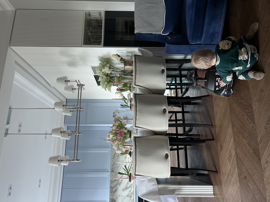The image displays a modern residential interior, encompassing kitchen, dining, and living areas. A young child, dressed in a dark green romper patterned with bear faces and light brown socks, is seated on a dark brown herringbone parquet floor, with hands on a black toy ride-on car positioned in front of them. In the mid-ground, a long table, likely a kitchen island, draped with a white linen tablecloth, is extensively arranged with multiple bouquets of pink tulips, white blossoming flowers, and pink tapered candles in various holders. Three light beige, high-backed bar stools with visible nailhead trim are pulled up to the table. The table's base appears to be a fluted white column. The background to the left features a kitchen area with light blue shaker-style upper and lower cabinets and a white marble backsplash. To the right, a dark blue velvet armchair with a grey throw blanket draped over it is visible. Adjacent to the armchair stands a tall built-in unit, distinguished by vertically fluted white panels, a glass-fronted cabinet displaying glassware, and an integrated dark appliance, likely a wine cooler or refrigerator, below it. A silver-toned metal chandelier with eight white fabric shades hangs centrally above the table. Recessed lighting is visible in the white ceiling. The specific location within Moscow, Russia, is not discernible from the visual evidence provided in the image.