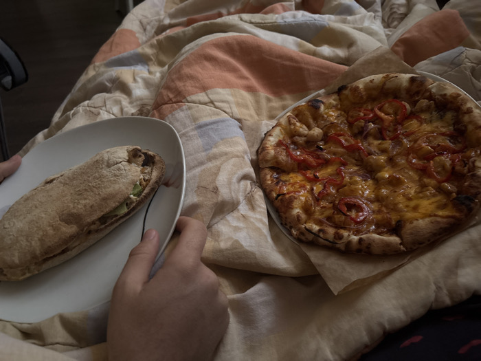 A person is observed in an indoor environment in Pernik, Bulgaria, presenting two food items. The individual's two hands, exhibiting light skin tone, are visible in the lower left, holding a white, oblong plate. This plate contains a single sandwich, enclosed in an elongated, golden-brown bread roll, within which a light-colored filling and green leaf components are discernible. To the right, a circular pizza rests on a piece of light-brown parchment paper, which is placed directly on a multi-patterned duvet. The duvet displays colors including beige, orange, and light brown. The pizza features a golden-brown crust, a melted cheese layer with yellow and orange coloration, and toppings consisting of sliced red bell peppers and discrete pieces of light-colored protein. A dark, indistinct object, consistent with furniture, is partially visible in the upper left background. A dark fabric with a subtle patterned motif is visible in the lower right corner.