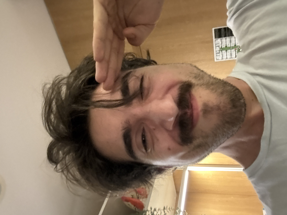 A man with dark hair and a beard strikes a playful pose, winking and raising his hand to his forehead in a mock salute. He wears a white shirt, and the background suggests an indoor setting. A light-colored wall is visible, along with a white shelf and a decorative item. The image is rotated, giving a slightly disoriented perspective.