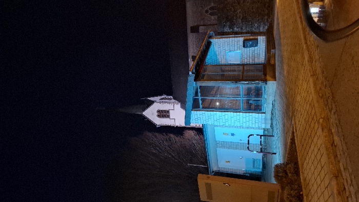 A nighttime shot showcases a reflective body of water next to a building with a pointed roof, its reflection shimmering on the water's surface. Adjacent to this scene, another structure glows with a bright blue light, drawing the eye. A brick facade frames the edge of the image. A side view mirror is visible in the upper right corner.