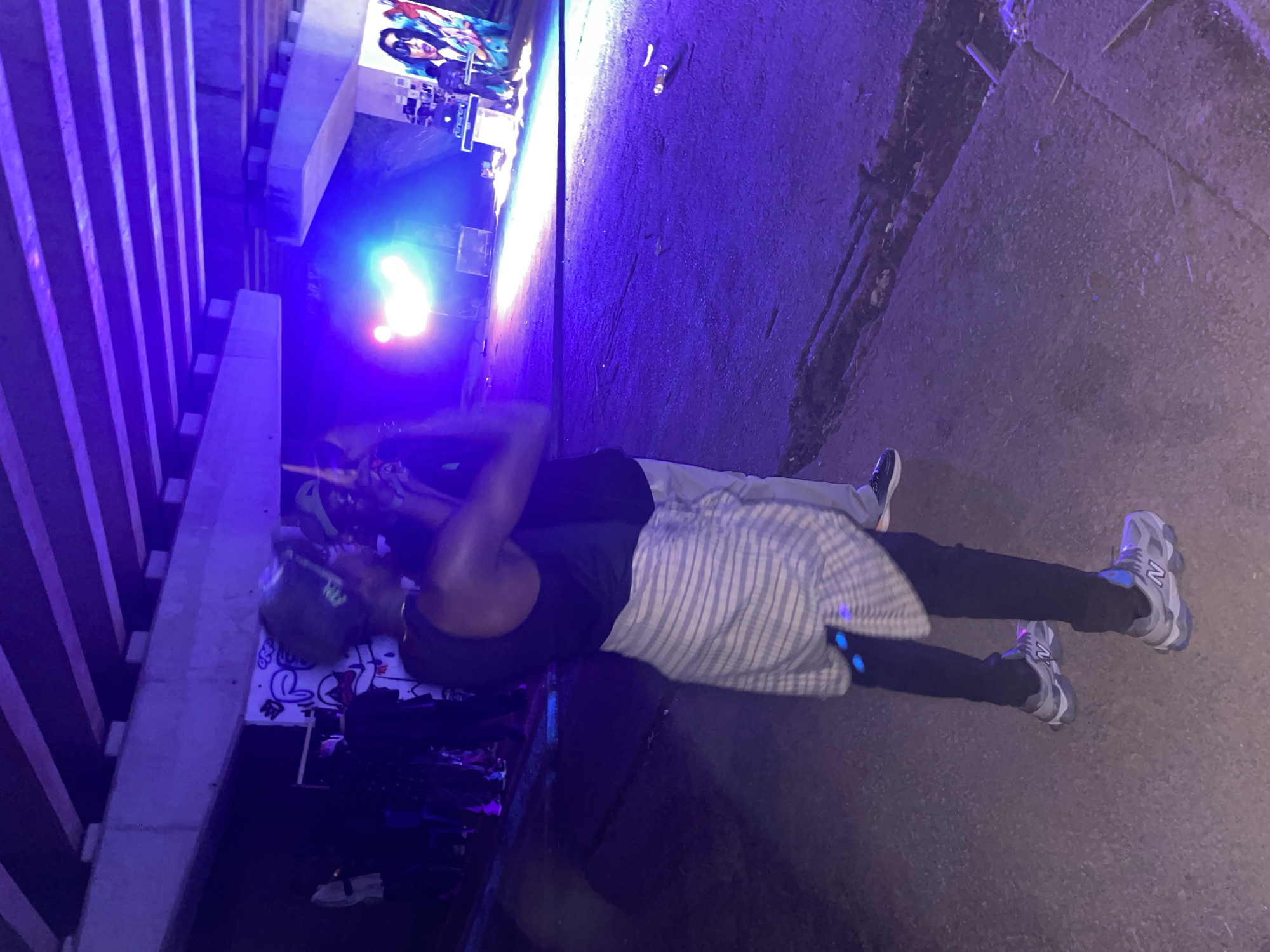 A person stands in a dimly lit outdoor space, possibly near a street or sidewalk, based on the pavement visible on the right side of the frame. The person is wearing a black tank top, black pants, and grey New Balance sneakers. They also have a patterned, light-colored jacket tied around their waist. The individual is positioned near what appears to be a concrete structure or a building with a row of beams or pillars. In the background, there's a stage or performance area with lighting and a screen displaying an image. Given the request, the location is assumed to be in the city of Jos, Nigeria, although no explicit geographical markers are directly observable in the image.