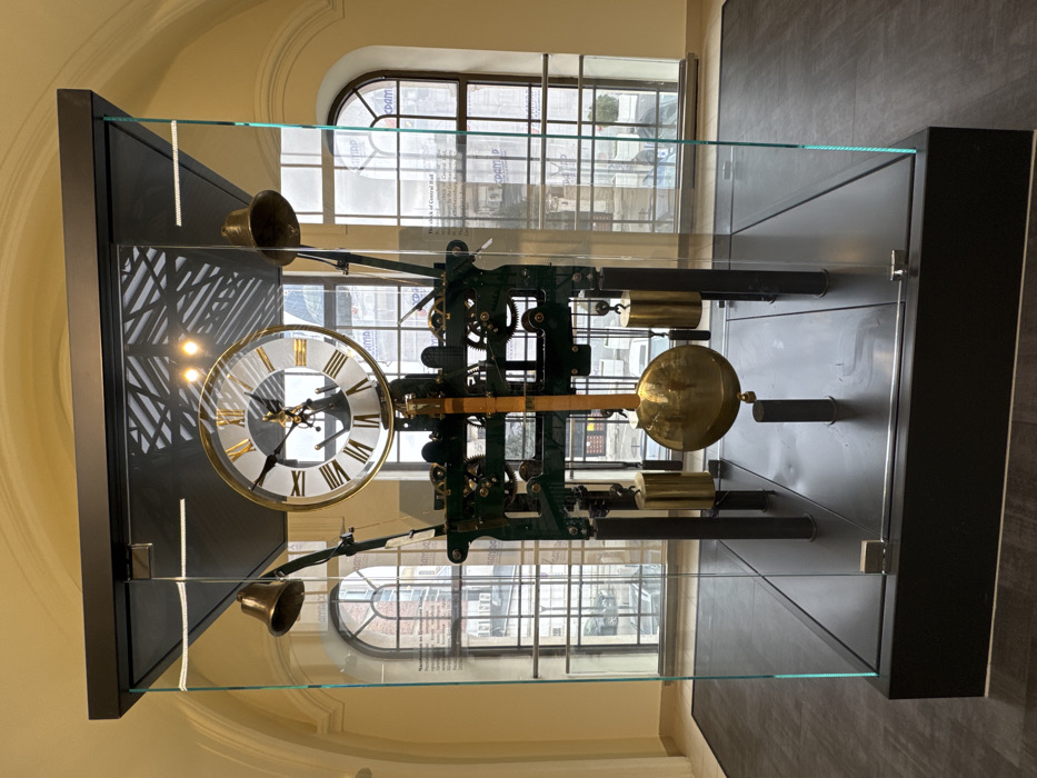 - "An antique, large-scale mechanical clock mechanism is displayed within a transparent glass case with a dark brown or black frame, set indoors on a dark tiled floor" by FM-MAcOG2, licensed under CC BY 4.0