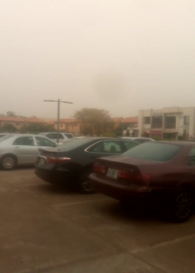The scene shows a parking lot filled with several cars, including a silver Peugeot, a dark red sedan, a black car, and some silver vehicles. The background reveals a series of buildings, possibly apartments or offices, with their orange roofs barely visible through the heavy fog or haze. The sky is completely overcast, contributing to the poor visibility. The overall atmosphere is muted and obscured by the pervasive haze.
