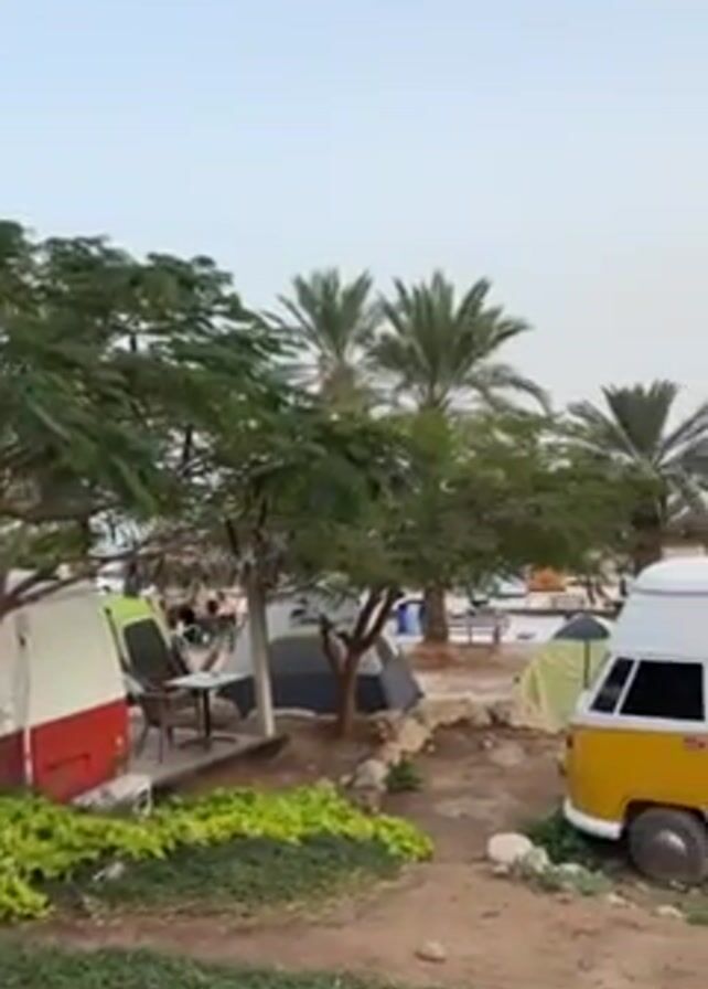 campground with colorful VW camper van replicas serving as camping cabins. The vans are painted in red, yellow, brown, and pink, all with white roofs. They are arranged among trees, including palm trees, and tents, with a beach and water visible in the background. People can be seen walking around in the distance. The sky is overcast.