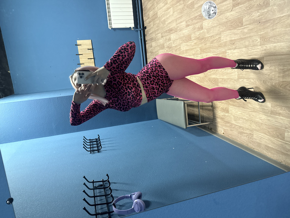 The image depicts a full-length mirror selfie taken indoors, reportedly in Saratov, Russia. The central subject is a person, likely female, with light-colored hair, wearing a two-piece ensemble consisting of a pink and black leopard print long-sleeved crop top and matching high-waisted shorts. She also wears bright pink fishnet stockings and black lace-up high-heeled ankle boots with white details. The subject is holding a light-colored smartphone with both hands, obscuring the lower portion of her face, while posing. The room features solid medium blue walls and a light-toned wooden or laminate floor. Reflected in the mirror are several objects: two black metal wall-mounted coat racks, one of which displays a pair of light purple JBL over-ear headphones; a small rectangular bench with a light grey padded seat and silver metal frame; a horizontal wooden rack with four dark pegs; and a white panel radiator situated on the far right. The ceiling is dark. A circular graphic resembling a cartoon face is visible in the bottom right corner of the mirror's reflection.