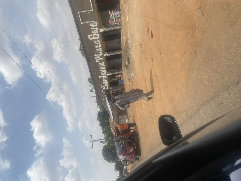 The scene is set outdoors in Tataura, Nigeria, under a bright, partly cloudy sky. The perspective is from within a dark-colored vehicle, with its side mirror visible in the lower left foreground. An unpaved, reddish-brown dirt road occupies the mid-ground. On the left side of this road, a red SUV or truck is parked, its rear tailgate open or damaged, exposing internal components. Three individuals are gathered around the vehicle's rear; one wears an orange shirt, and another a dark shirt. In the center-right of the mid-ground, a man in a light grey traditional long tunic and dark shoes walks from left to right across the dirt road, carrying a dark briefcase in his left hand. On the right side of the road, the "Sardauna Plaza Gwt" building is visible. It is a single-story, light grey structure featuring multiple commercial bays. A pile of dirt and rocks is located in front of the plaza, to the right of the walking man. Stacks of bottled or canned beverages are arranged outside one of the plaza's bays on the far right. In the background, a wooden utility pole with multiple overhead power lines is present on the left. Green trees and additional structures are visible behind the vehicles and buildings.
