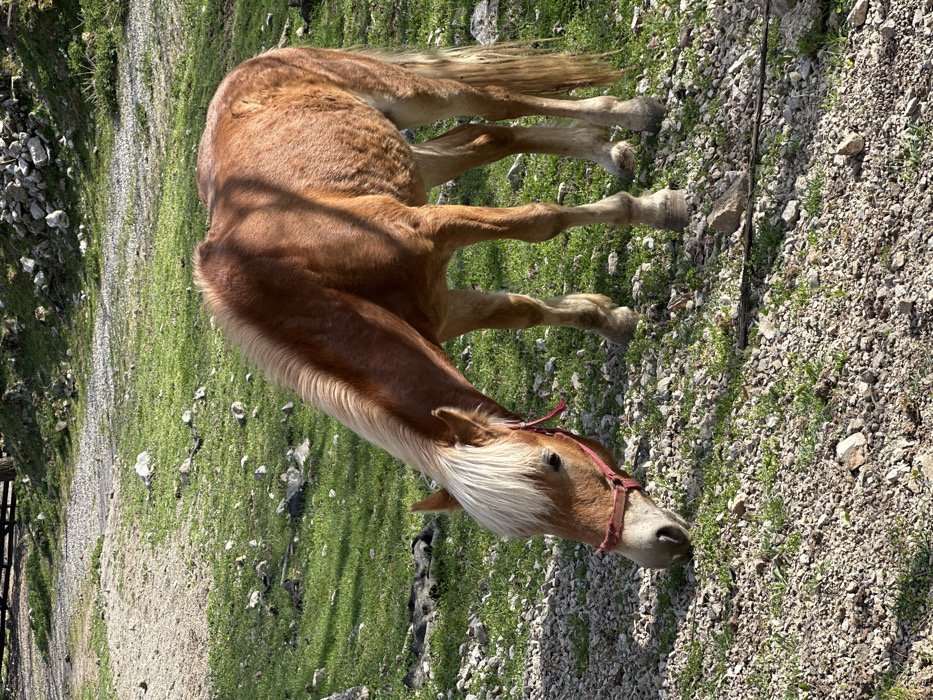 - "A single chestnut-colored horse, with a flaxen mane and tail, stands in a partially rocky, grassy field within Despotovac Municipality, Serbia" by FM-LrxUq1, licensed under CC BY 4.0