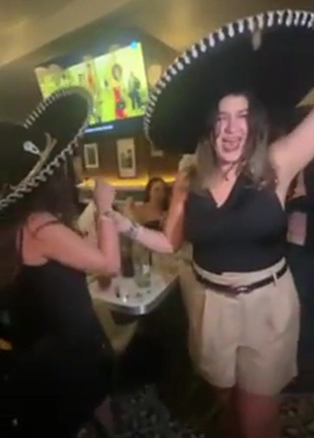 Two women wearing large black sombreros are dancing closely together in a crowded bar. One woman wears a black dress and the other wears a black top and khaki shorts with a belt. They are smiling and appear to be enjoying themselves. There are other people in the background, including a woman sitting at a table. A TV screen is visible on the wall behind them. The bar has a patterned floor and a warm, intimate atmosphere.