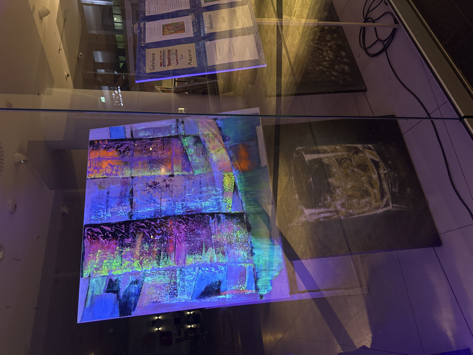 The image displays a night-time view through a glass display window into an interior art exhibition space located in Hamburg, Germany. In the left foreground, a large, rectangular abstract painting stands on an easel, rendered in fluorescent blues, purples, greens, and oranges under ultraviolet illumination. The artwork features textured, layered brushstrokes forming distinct vertical and horizontal segments. Directly below this, a smaller, square painting depicts a realistic glass containing ice and a beverage, set against a dark background. To the right, positioned behind a vertical glass partition, a light-colored display board is visible, affixed with multiple white printed notices. Partially legible text on these notices includes "Gutscheine für Malkurse" (Vouchers for painting courses) and "Malkurse und Workshops" (Painting courses and workshops). The floor of the exhibit area is tiled in a light, uniform color. A black electrical cord lies coiled on the floor in the lower right section of the frame. Reflections of interior overhead lighting and architectural elements are visible on the glass surface. No individuals are present in the scene.