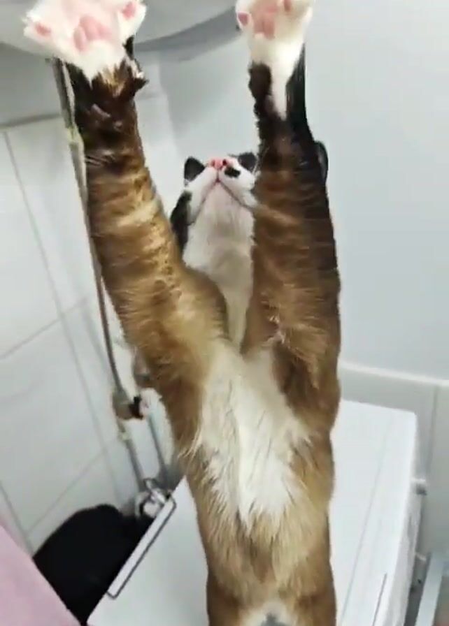 cat standing on its hind legs on top of a washing machine in a bathroom. A hand appears, bringing a clear cell phone case close to the cat's front paws. The cat appears to grab the case with its paws. The case is then removed, and the cat sits on the washing machine, looking upwards with a slightly annoyed expression.