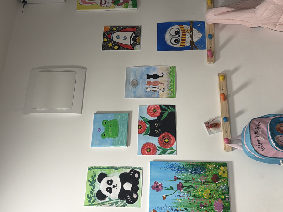 - "The image displays a brightly lit white wall in an interior space located in Varna, Bulgaria, adorned with a collection of children's artwork and functional storage elements" by FM-PpUaz2, licensed under CC BY 4.0
