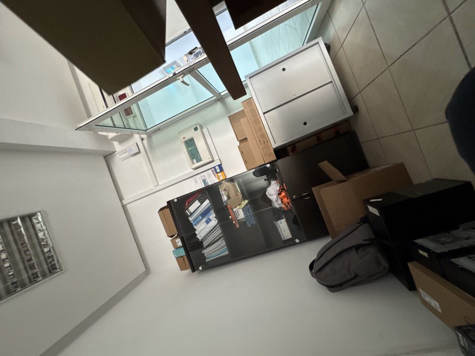 The image displays an indoor office or storage room in Douyet, Morocco, captured from a low, tilted angle
