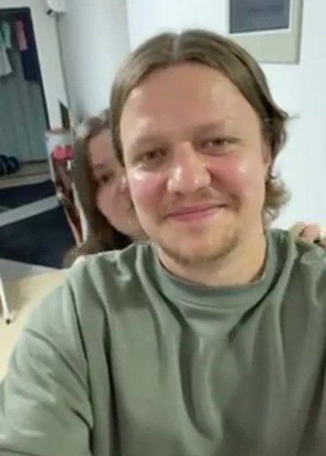 A man in a green sweatshirt smiles at the camera. He has light brown hair and a slight goatee. A woman appears behind him and gives him a kiss on the cheek. The background is a white-walled room with a glimpse of a hallway. There is a picture frame on the wall behind him.