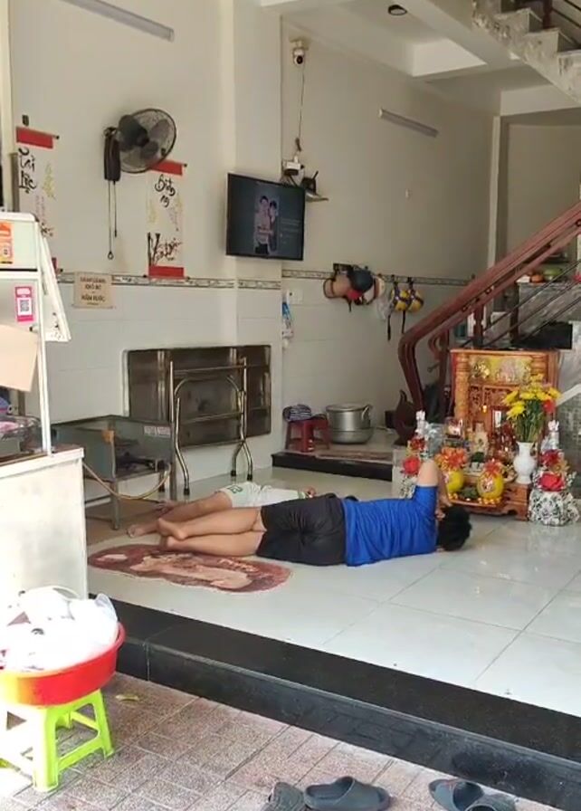 interior of what appears to be a house or shop in Vietnam. Two people are lying on a rug on the tiled floor. One person is wearing a blue shirt and dark shorts, while the other is wearing a white shirt and dark shorts. They are lying head-to-head on the rug. In the background, there is a television mounted on the wall, a fan, and a small altar. There are also several pairs of sandals scattered on the floor near the entrance. A red and green stool sits next to a white basin in the foreground.