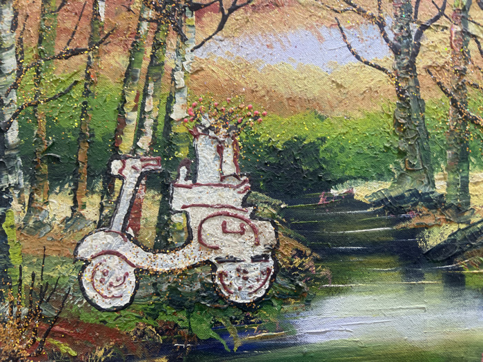 An impressionistic landscape painting features a white scooter with dark brown outlines parked beside a stream