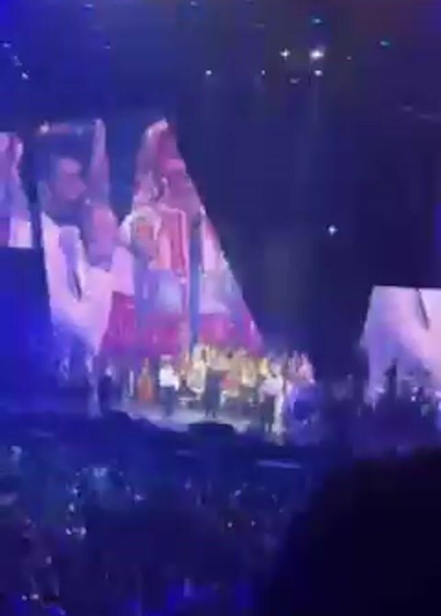 live concert performance. The stage has a large screen displaying a close-up image of what appears to be a man in a white shirt. In front of the screen, there is a group of performers on the stage, although the distance and lighting make it difficult to identify them individually. The venue is filled with a large crowd of people. There are stage lights shining onto the stage and the crowd. The atmosphere is filled with excitement and energy. The quality of the video is low.