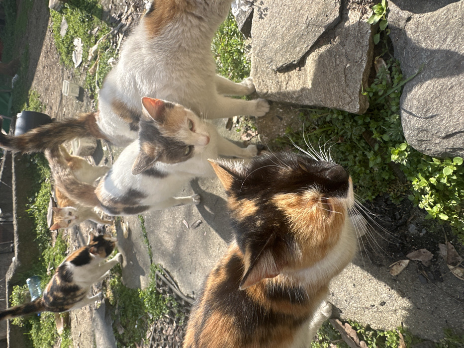 This image depicts an outdoor scene in Semchinovo, Bulgaria, under bright daylight. Six domestic cats are visible. In the immediate foreground, a calico cat with distinct black, orange, and white fur is positioned on the left, its head lowered towards the ground. Prominent white whiskers are visible. To its right and slightly behind, a second calico cat, predominantly white with grey, black, and orange patches, stands facing the viewer with its head slightly tilted down. A third cat, showing white and orange/brown markings, is partially visible behind the second cat on the right. Further back, a concrete path runs horizontally across the mid-ground. On the left side of this path, a fourth calico cat, similar in coloration to the foreground cat, has its head lowered, appearing to interact with the ground. To its right, an orange tabby cat stands, looking left. A fifth cat, displaying white and orange/brown patches, is partially obscured behind the orange tabby in the background. The ground surface consists of a mixture of concrete or paving stones, exposed soil, and patches of green herbaceous vegetation. Several irregular grey stones are present, contributing to an uneven terrain. Strong sunlight illuminates the scene, casting defined shadows. In the distant background, a dark, possibly cylindrical object and a low concrete or stone wall are discernible. The cats appear gathered in proximity, suggesting a collective focus or activity.
