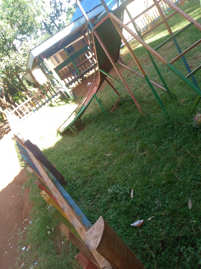 A colorful wooden fence sits at the edge of a grassy area. Beyond it lies a playground with climbing bars and a slide. A structure with a roof, possibly a covered play area or small building, stands further in the background. The playground is set on grass with some weeds and litter. Sunlight creates strong shadows in the scene, highlighting the playground equipment and fence. A variety of colors are evident on the wooden structures.
