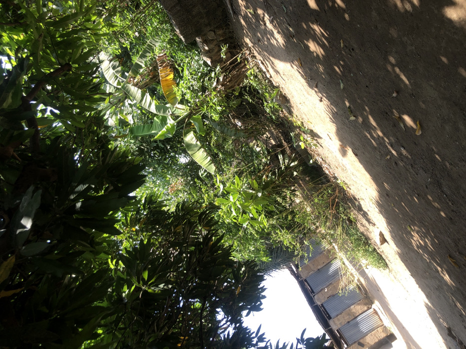 This image depicts an outdoor environment in Kurudu, Nigeria, under direct sunlight, creating strong contrasts between illuminated and shaded areas. The foreground consists of an unpaved dirt path or ground surface, exhibiting dappled light and numerous shadows cast by overhead foliage, with scattered dried leaves present. To the left, a structure composed of multiple adjacent units is visible, featuring at least five distinct corrugated metal doors. The walls of this structure appear to be light-colored masonry or concrete. A partial roofline, likely also corrugated metal, is visible above the doors. The upper and central portions of the image, extending to the right, are dominated by dense green vegetation, including large-leafed plants resembling banana trees, smaller shrubs, and a canopy of trees. No individuals, specific actions, or interactions are discernible within the frame.