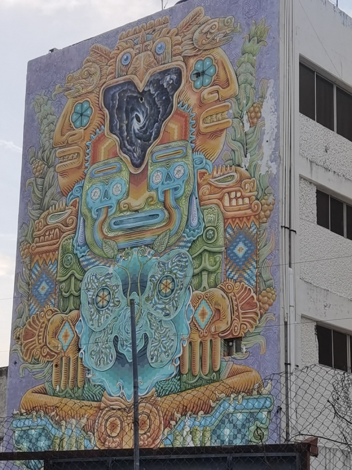 large mural painted on the side of a building in Cancún, Mexico, located at latitude: 21