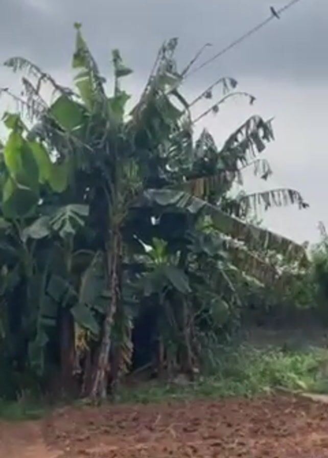 The video presents a rural scene under an overcast sky. In the foreground is a plot of cultivated land, showing rows of tilled soil. To the side, a cluster of banana trees with large, partially frayed leaves stands prominently. Several bananas are hanging from a central tree. Overhead, power lines stretch across the sky, with at least one bird perched on them. In the background, additional greenery suggests a dense, natural environment. The scene appears to be a simple, agricultural setting.