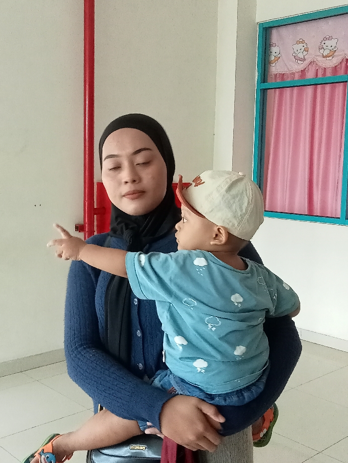 A woman wearing a black headscarf holds a young child wearing a blue shirt with white cloud patterns. The child wears a tan baseball cap and points with his left hand. The woman is wearing a blue sweater. A red pipe runs vertically along the wall to the left of the woman. A window with a blue frame and pink curtains featuring Hello Kitty images is visible in the upper right corner.