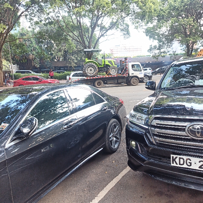 This image depicts an urban street scene in Nairobi, Kenya, under a clear sky. In the immediate foreground, a black Mercedes-Benz sedan is parked on the left, with its driver's side profile visible. To its right, the front fascia of a black Toyota Land Cruiser is partially visible, displaying a Kenyan license plate beginning with "KDG". In the midground, a white flatbed tow truck is positioned on the roadway, transporting a bright green utility tractor secured to its bed. To the left of the tow truck, a red sedan is parked along the roadside, with a single individual wearing a red shirt standing nearby. Additional vehicles are partially discernible further down the street. The background features dense green foliage from large trees, behind which urban multi-story buildings are visible, indicative of a city environment.