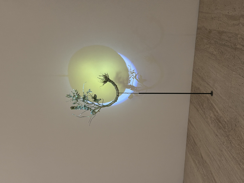 A close-up depicts an art installation against a white wall, intersected by a textured beige wall on the right. A spherical light source illuminates a decorative, curved branch featuring delicate, silvery foliage and what appears to be a butterfly detail. A thin, horizontal rod extends from the branch to the beige wall, where it is affixed with a circular mount. The lighting creates a soft shadow of the branch and rod on the white wall.