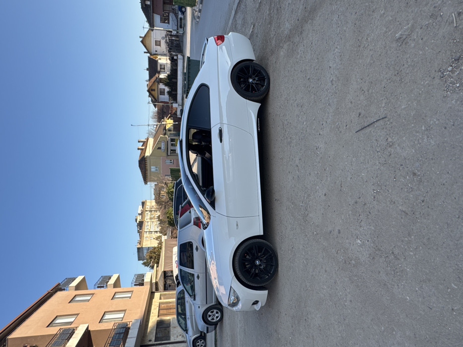 The image displays an outdoor urban scene in Knezha, Bulgaria, under a clear, cloudless blue sky. A white two-door BMW coupe, featuring black multi-spoke wheels, a black roof, and an "M Performance" decal on the lower side skirt, is parked facing left on an unpaved, light gray gravel surface. Behind the BMW, a silver Volkswagen Golf hatchback is parked, followed by a silver SUV and other partially visible vehicles. To the immediate left, a multi-story building with a light brown facade, multiple windows, and balconies with dark railings is visible. In the mid-ground, a street with a curved curb on the right separates the foreground from background structures. On the far side of the street, various buildings are present, including a prominent two-story building with a light yellow facade and a brown tiled roof, possibly housing a commercial establishment at ground level. Further in the distance, additional residential buildings and trees are visible. A green municipal waste bin is located on the right side of the road, adjacent to the curb. The scene is devoid of human presence or active interactions.