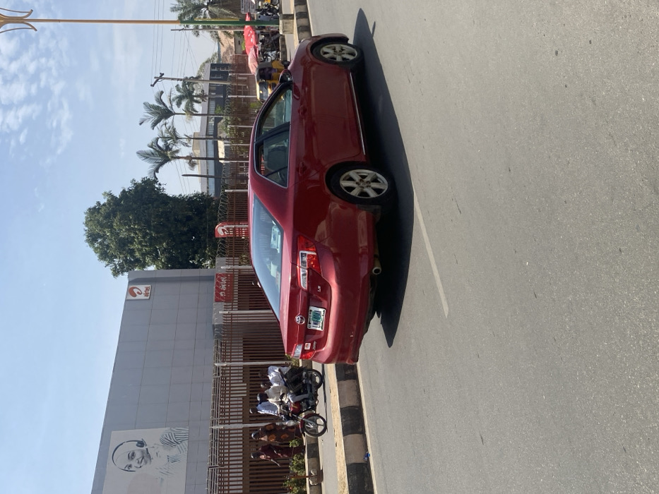 This image depicts a bustling street scene in Kabala, Nigeria, under clear, sunny daytime conditions. In the immediate foreground, a red Toyota Camry sedan (model year approximately 2007-2011) is positioned on a grey asphalt road, facing away from the viewer. The vehicle displays a white and green Nigerian license plate reading "LMK 400" and an "LE" trim badge on its trunk. A faint white lane marking is visible on the asphalt surface. To the left of the road, a concrete curb with black and white painted stripes borders a sidewalk area. On the sidewalk, a group of approximately five to six individuals are visible, some appearing to walk. Closest to the curb, a red motorcycle carries two male riders, both wearing light-colored shirts. The background is dominated by a large, light-grey commercial building featuring horizontal paneling. A prominent black-and-white mural of a smiling woman wearing a headset is displayed on the building's upper left facade. Multiple red "Airtel" logos are visible on the building and on freestanding signs behind a dark metal fence topped with razor wire, which separates the building frontage from the street. To the right of the building, several green trees, including palm trees, stand against a bright blue sky. Further down the street on the right, a tall, light-colored street lamp post is visible, along with glimpses of yellow commercial tricycles (keke napeps) and red-canopied street stalls, indicating further commercial activity.
