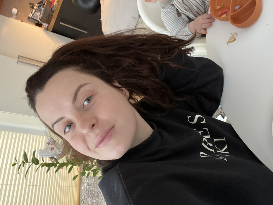 A female, appearing in her 20s to 30s, with dark brown hair tied back and light-colored eyes, occupies the left and central foreground of the frame. She is observed looking directly at the camera with a slight smile. She is wearing a black long-sleeved top with white lettering partially visible as "PRE'S AKI." To her right, an infant or toddler is partially visible, seated in a white high chair. Only a hand, part of an arm, and a striped garment are discernible. The high chair tray contains scattered food debris and two orange, partitioned silicone plates holding food remnants. In the background to the left, a window with horizontal blinds is visible, alongside a tall, slender green plant. The far background on the right reveals a kitchen area with dark lower cabinets, a light-colored countertop, and various items including a woven basket and appliances. The scene is an indoor, domestic setting, located in the city of Gangloff, Germany.