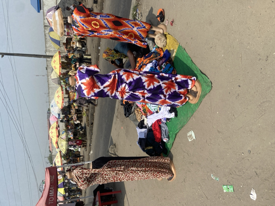 The image depicts a bustling outdoor market scene in Alasia, Nigeria, characterized by street-side vendors and pedestrian traffic under bright daylight. In the foreground, three headless mannequins, standing on circular wooden bases, display women's clothing directly on the dirt and asphalt ground. The leftmost mannequin wears a long, form-fitting, brown and cream leopard-print dress with dark trousers underneath. The central mannequin exhibits a purple, white, and orange tie-dye patterned long dress. The rightmost mannequin displays an orange, blue, and black patterned dress. These mannequins are positioned on and beside a green tarpaulin spread on the ground, which holds various piles of folded and loose clothing for sale. Behind the central display, partially obscured, a person is seated on the ground, wearing a dark shirt and a colorful head covering. Scattered debris, including discarded paper and plastic wrappers, is visible on the ground. In the midground, a paved road separates the foreground display from a dense array of market stalls. These stalls are sheltered by numerous large, colorful umbrellas, predominantly yellow, white, and striped, indicating a lively commercial area. Visible beneath the umbrellas are various goods, likely produce and other merchandise, displayed on tables or directly on the ground. Numerous individuals, appearing as customers and vendors, traverse the area, engaged in market activities. A red canopy with white text, partially reading "TO IMAGINE," is visible on the far left. Utility poles and overhead wires are present, indicating urban infrastructure. The background features a tall, plain concrete wall, suggesting a boundary or building. The sky is clear, and the overall lighting suggests a sunny day.