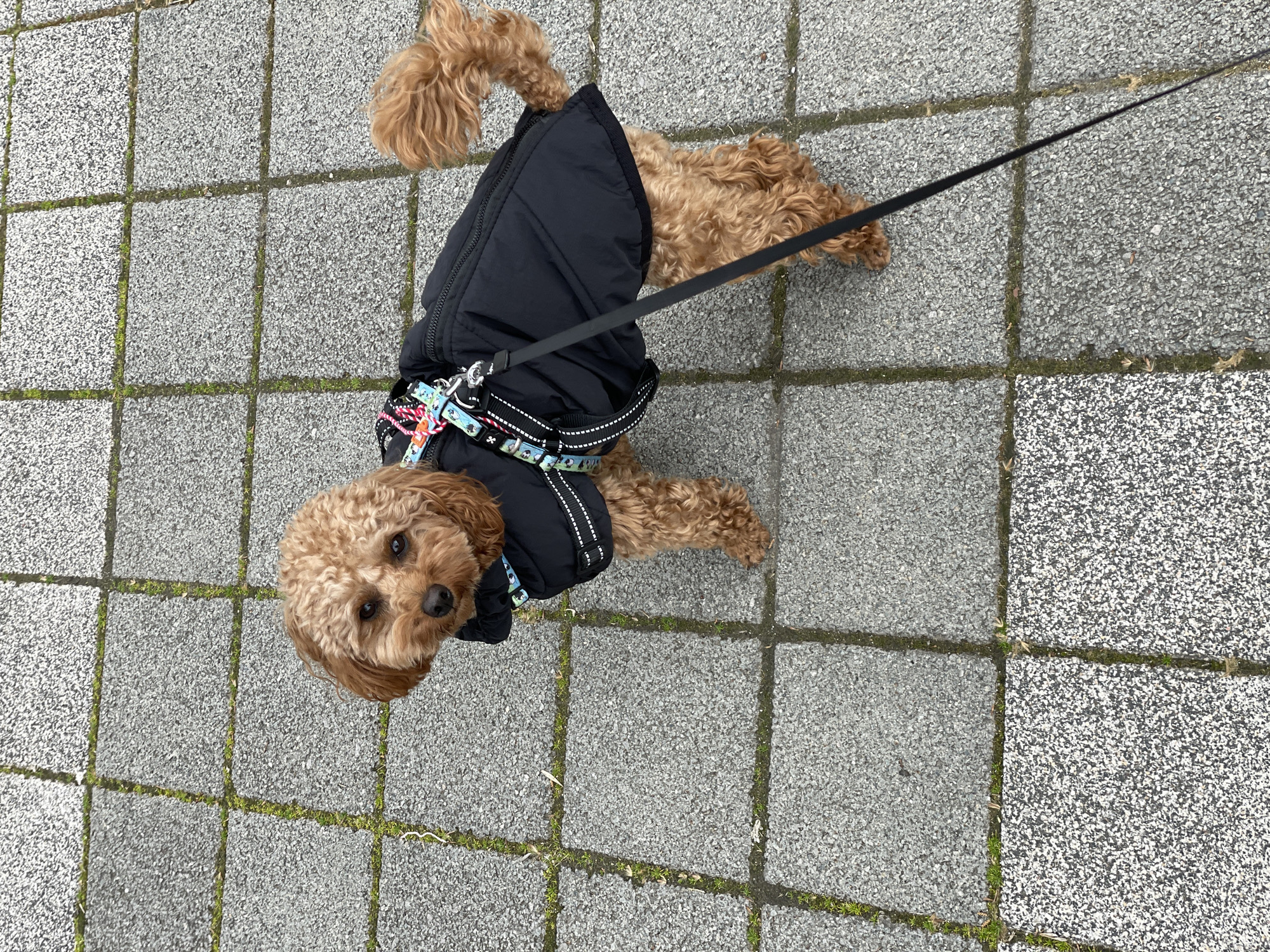 A brown poodle wearing a black coat and a colorful harness stands on a gray paved surface with a black leash attached. The paved surface is made of square stones with thin lines of green vegetation growing between them. The dog looks up towards the camera. The location cannot be determined solely from the image.