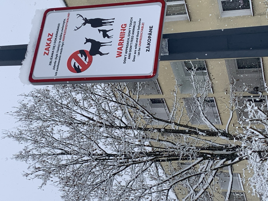 The sign warns against approaching or feeding deer in Zakopane. It displays a stag, a doe, and a fawn, crossed out with a red circle. In both Polish and English, it explains that deer are wild animals and their behavior can be unpredictable. The Polish text reads, "ZAKAZ ZBLIŻANIA SIĘ I DOKARMIANIA! Jelenie (byk i łania) to dzikie zwierzęta. Ich zachowanie może być NIEPRZEWIDYWALNE!" The English text says, "WARNING DON'T APPROACH, DON'T TOUCH AND DON'T FEED ANIMALS! Deer are wild and their behavior can be UNPREDICTABLE!"