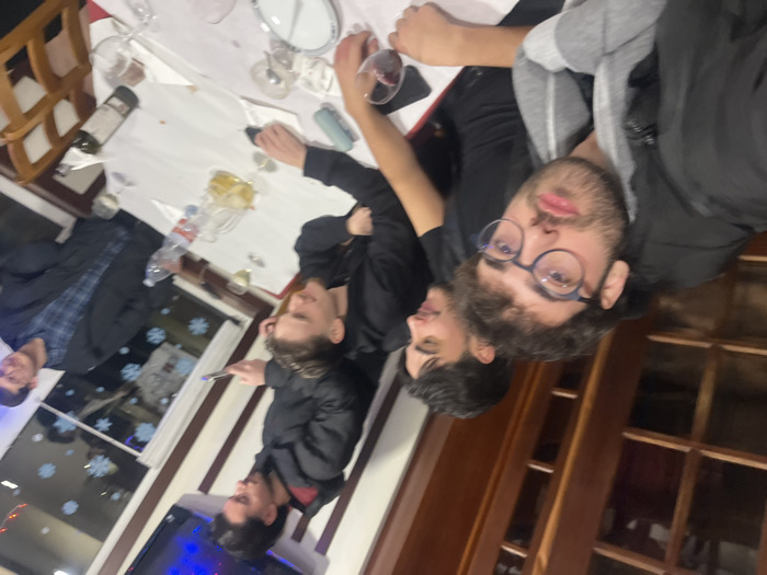 A group of four men are gathered around a table with drinks, bottles, and plates. The table is covered with a white tablecloth. One man wears glasses and a gray jacket, while another holds a glass of red liquid. A window with snowflake decorations is visible. A television with blue lights is in the background. The overall setting appears to be indoors, possibly a home or restaurant during a festive occasion.