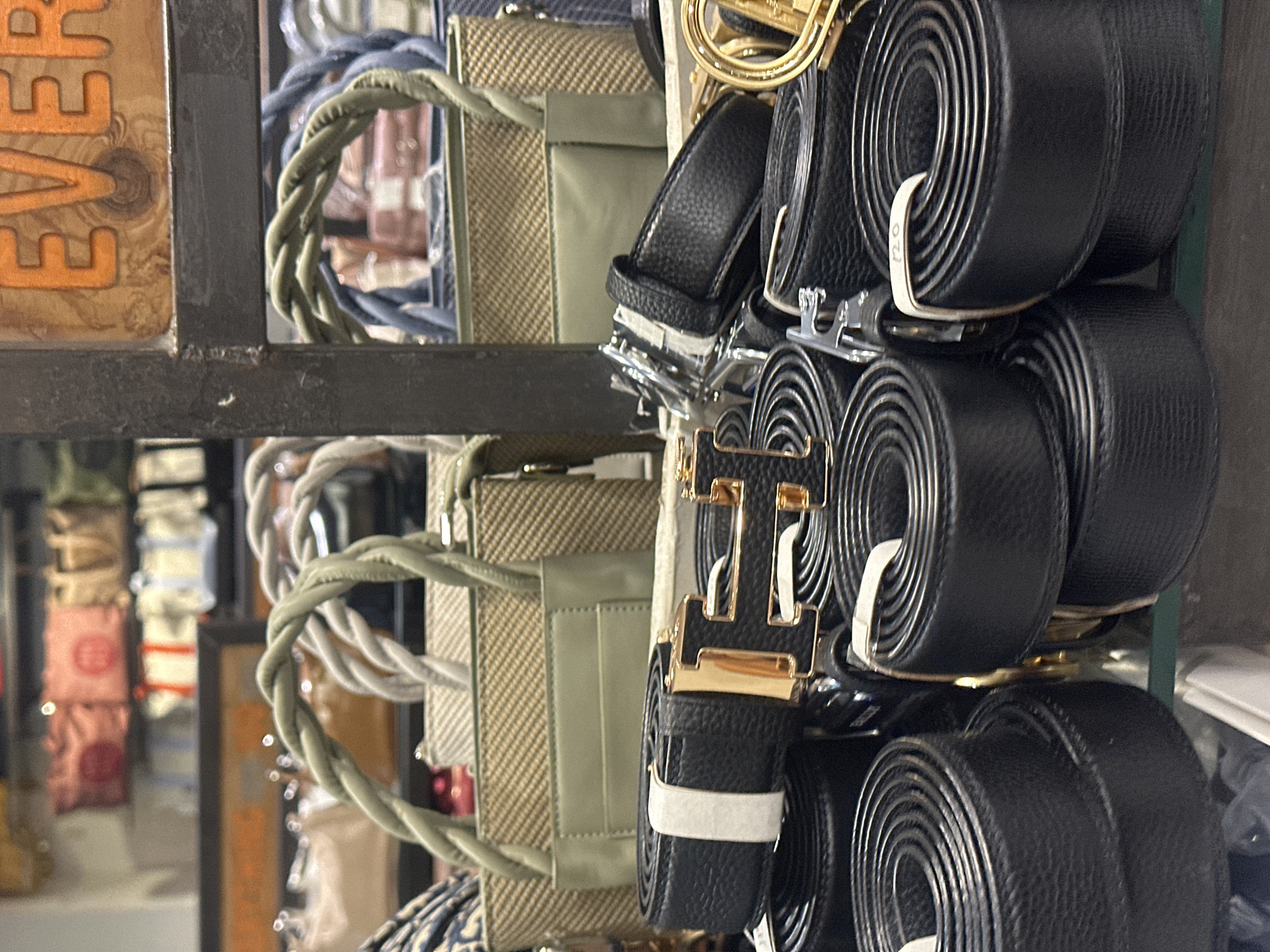close-up of a display rack in a shop. On the right are several black leather belts rolled up and secured with white paper bands. The belts have various buckle styles including gold and silver metal buckles in "H" and traditional prong styles. To the left of the belts are several bags with woven and solid green fabric. In the background, partially obscured by the rack structure, are other textiles in a variety of colors and patterns, and an "EVER" sign in orange. The scene is a retail environment in Kuta, Indonesia.