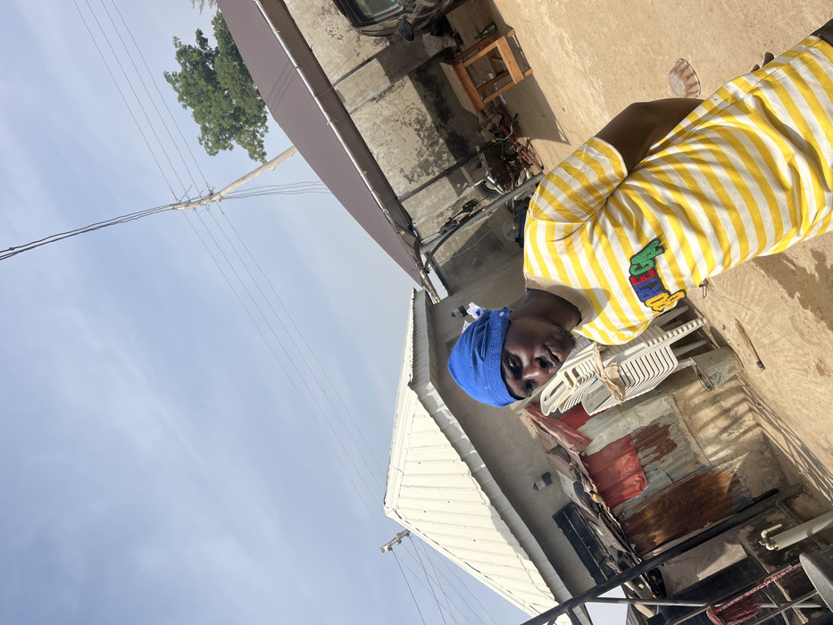 An outdoor scene in Kakau, Nigeria, is depicted under a clear, light blue sky with wispy clouds