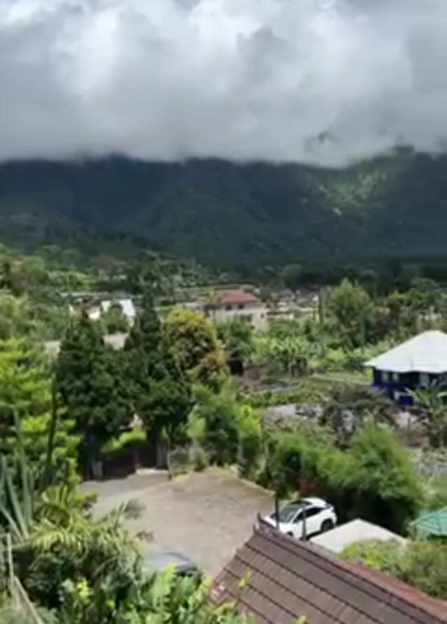 panoramic view of a rural landscape. In the foreground, there are rooftops of buildings with brown tiling, surrounded by lush green vegetation including trees and shrubs. A white car is parked in a driveway, and in the distance, there are houses scattered across the terrain, interspersed with more greenery. The background features a large mountain range partially obscured by thick, low-hanging clouds. As the camera pans slightly, a lake comes into view behind the town, bordered by more mountains covered in trees. The sky is overcast, with patches of blue peeking through the clouds. The overall impression is one of a tranquil countryside scene.